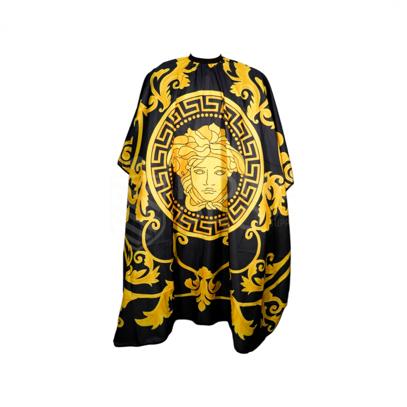 As Capas para Barbeiro LMPRO foram desenvolvidas para profissionais que buscam unir funcionalidade, resistência e identidade visual forte no ambiente de trabalho. Com estampas marcantes e acabamento profissional, contribuem para uma apresentação mais moderna e organizada durante o atendimento. Este modelo apresenta estampa icônica e luxuosa, inspirada no design Versace, com uma grande cabeça de Medusa central em dourado, cercada por padrões gregos e arabescos barrocos sobre um fundo preto profundo.