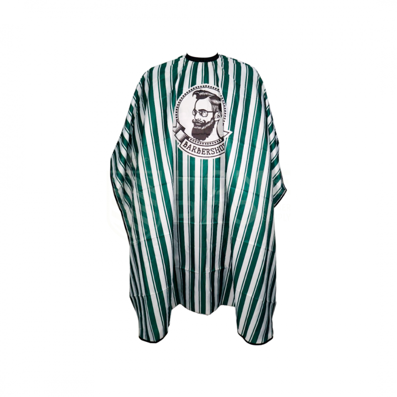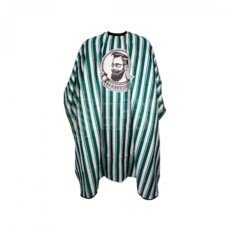 Capa profissional LMPRO 64, leve e resistente, com estampa clássica de listras verdes e brancas e logo circular de barbeiro. Possui tamanho de 160 cm x 140 cm, proporcionando proteção completa e praticidade.