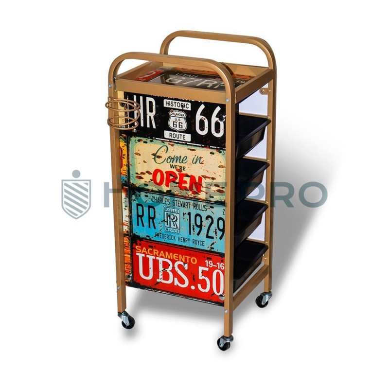 El diseño moderno y funcional del Trolley Vegas acentúa el dinamismo, el encanto y la practicidad. Sus cajones se abren a ambos lados y dispone de soporte para secador, cepillo, tijeras y brochas.